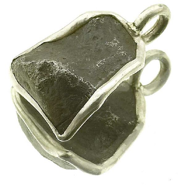 Das nebenstehende Meteoritenstück mit seiner original Schmelzkruste habe ich in grob geschmiedetem Silber als Anhänger gefasst.